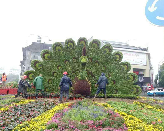 这类造型分为平面模纹花坛与立体绿雕两大类,平面款式多用于拼接几何图案、文字标识,线条规整、色彩匀称;立体款式则可塑造动物、卡通形象、建筑、主题雕塑等各类形态,立体感足,形态栩栩如生。制作时,先根据设计方案搭建钢筋、合金轻量化骨架,稳固抗风,再在外层铺设铁丝网,填充轻质营养土并固定,随后按照色彩分区,高密度扦插草苗,先勾勒轮廓再填充细节,保障图案清晰、色彩准。