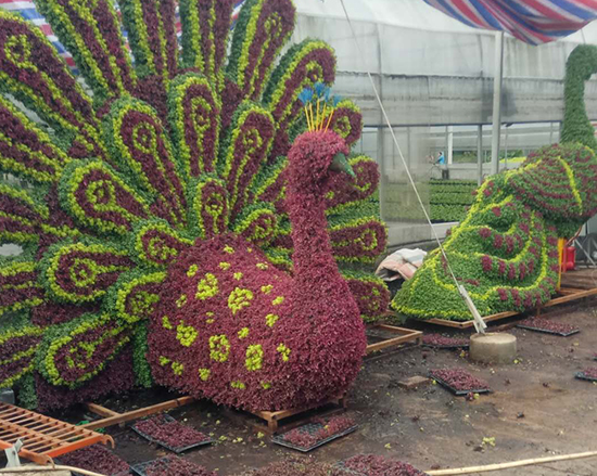 这类造型分为平面模纹花坛与立体绿雕两大类,平面款式多用于拼接几何图案、文字标识,线条规整、色彩匀称;立体款式则可塑造动物、卡通形象、建筑、主题雕塑等各类形态,立体感足,形态栩栩如生。制作时,先根据设计方案搭建钢筋、合金轻量化骨架,稳固抗风,再在外层铺设铁丝网,填充轻质营养土并固定,随后按照色彩分区,高密度扦插草苗,先勾勒轮廓再填充细节,保障图案清晰、色彩准。