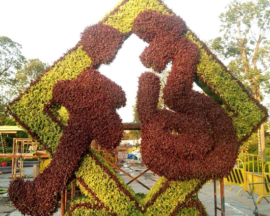 这类造型分为平面模纹花坛与立体绿雕两大类,平面款式多用于拼接几何图案、文字标识,线条规整、色彩匀称;立体款式则可塑造动物、卡通形象、建筑、主题雕塑等各类形态,立体感足,形态栩栩如生。制作时,先根据设计方案搭建钢筋、合金轻量化骨架,稳固抗风,再在外层铺设铁丝网,填充轻质营养土并固定,随后按照色彩分区,高密度扦插草苗,先勾勒轮廓再填充细节,保障图案清晰、色彩准。