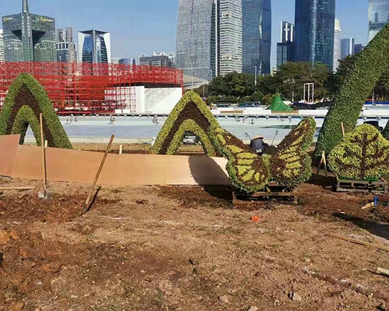这类造型分为平面模纹花坛与立体绿雕两大类,平面款式多用于拼接几何图案、文字标识,线条规整、色彩匀称;立体款式则可塑造动物、卡通形象、建筑、主题雕塑等各类形态,立体感足,形态栩栩如生。制作时,先根据设计方案搭建钢筋、合金轻量化骨架,稳固抗风,再在外层铺设铁丝网,填充轻质营养土并固定,随后按照色彩分区,高密度扦插草苗,先勾勒轮廓再填充细节,保障图案清晰、色彩准。