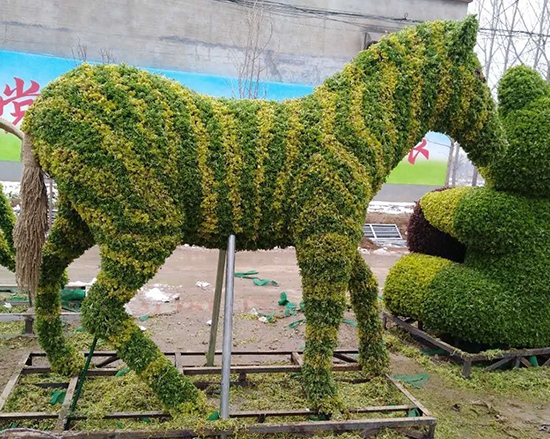 造型主打具象仿生、几何规整、主题文创三大类,常见稻草人、动物、宝塔等款式,先搭防锈钢架稳固骨架,再分区密植五色草,后期定期修剪定型。该造型易养护,耐旱耐修,观赏期长,既能做小品点缀,也能做核心景观,平衡植物生长与艺术美感。