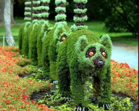 造型主打具象仿生、几何规整、主题文创三大类,常见稻草人、动物、宝塔等款式,先搭防锈钢架稳固骨架,再分区密植五色草,后期定期修剪定型。该造型易养护,耐旱耐修,观赏期长,既能做小品点缀,也能做核心景观,平衡植物生长与艺术美感。