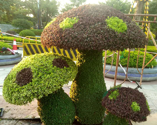绿雕选材格外讲究,优先选用枝叶细密、耐修剪、色彩丰富的五色草品种,涵盖绿、红、黄、白、紫五大色系,无需开花便能凭借鲜亮叶色营造层次,且植株生命力强、适应力好,适合立体密植与精细修剪。造型设计兼顾美感与植物生长规律,分为具象仿生款、几何规整款和主题文创款,像经典的稻草人绿雕、动物造型、宝塔造型都十分常见,线条圆润协调,突出核心形态,避免过于细碎复杂的设计。