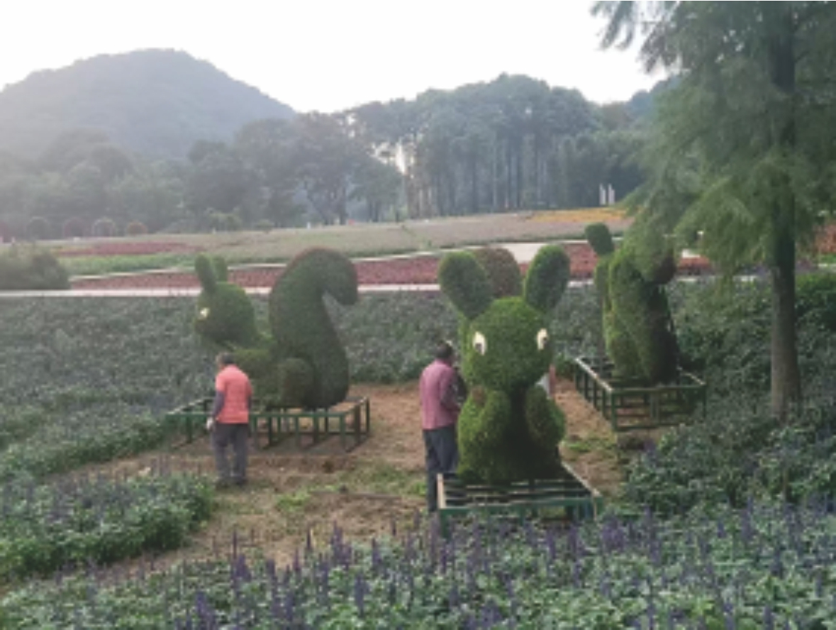 立体花坛以精心选育的五色草、佛甲草、时令花卉、矮生绿植为主要栽植材料,搭配稳固的钢结构骨架,经过专业设计、骨架焊接、种苗栽植、后期修剪养护等多道工序,打造出形态各异的立体绿植造型。区别于传统平面花坛,它突破空间局限,打造三维立体景观,造型题材丰富多元,可根据不同场景与主题需求,定制动物造型、吉祥图腾、地标建筑、节庆主题、卡通形象、文字标语等各类样式,线条流畅饱满,形态逼真生动,层次错落分明,整体立体感。